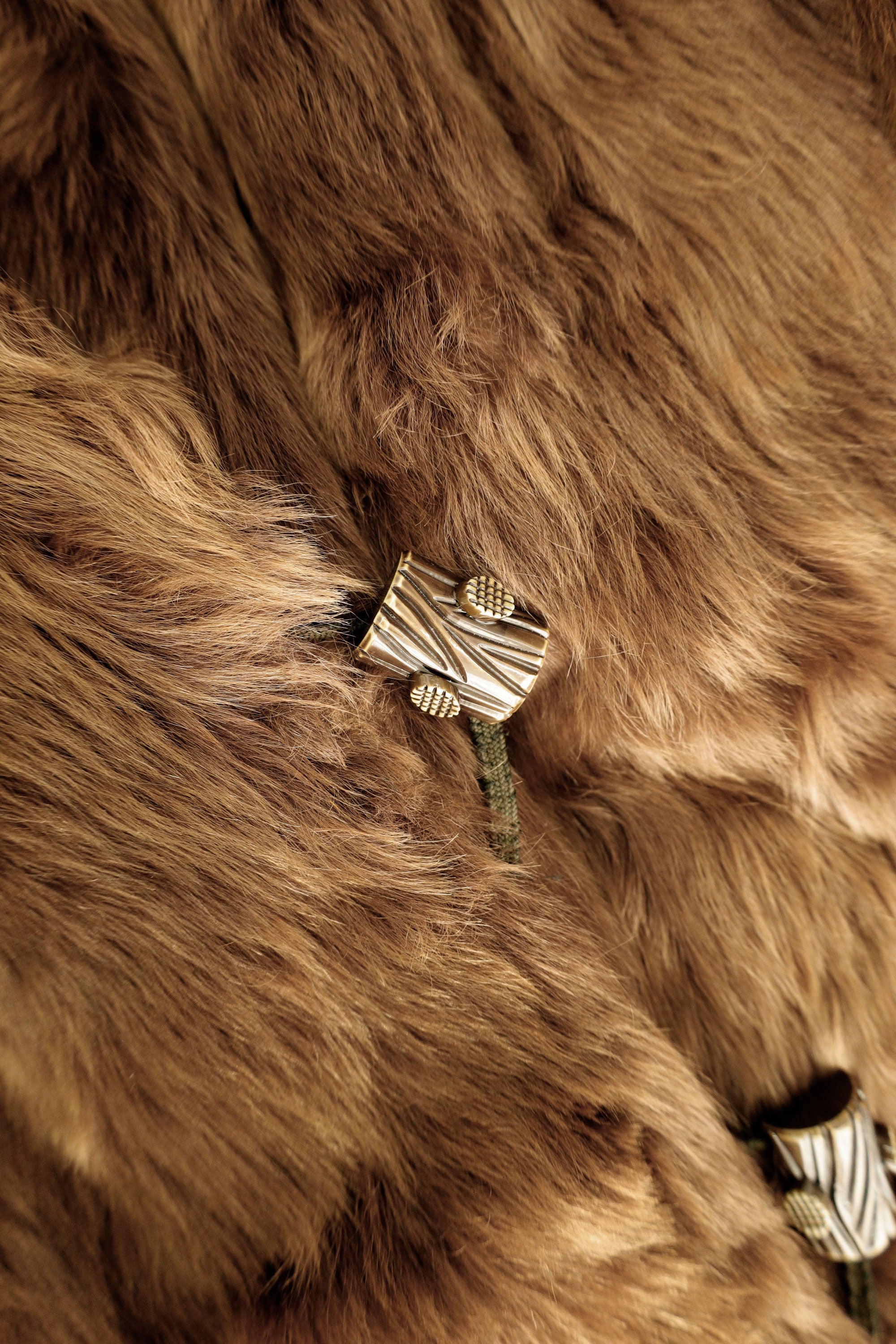 The long, slightly coarse pile gives it weight and presence, while the sleeves are set at a strong forward angle, creating a dramatic, almost sculptural silhouette.