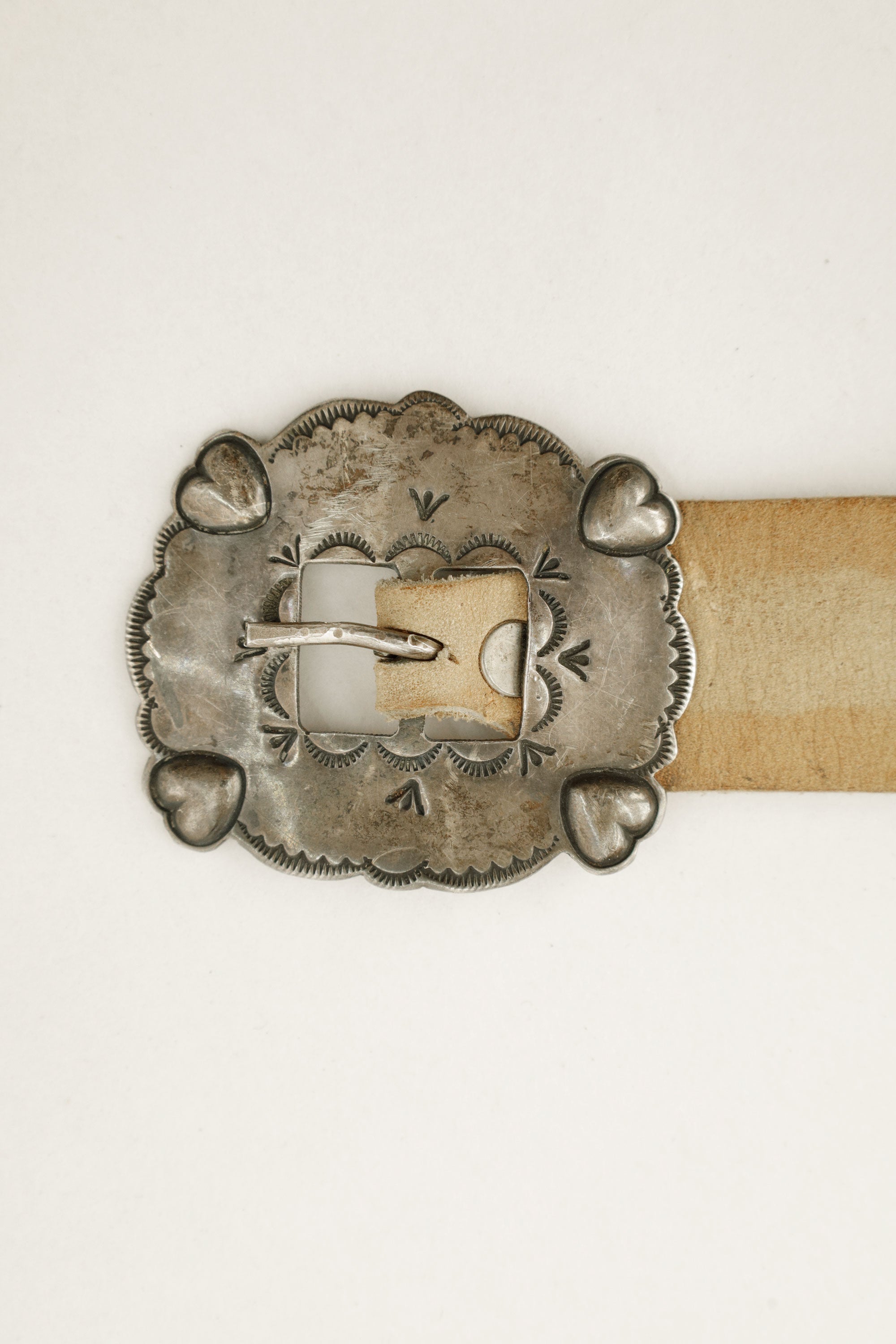 A Navajo concho belt where radiating silver forms are quietly softened by small heart motifs.