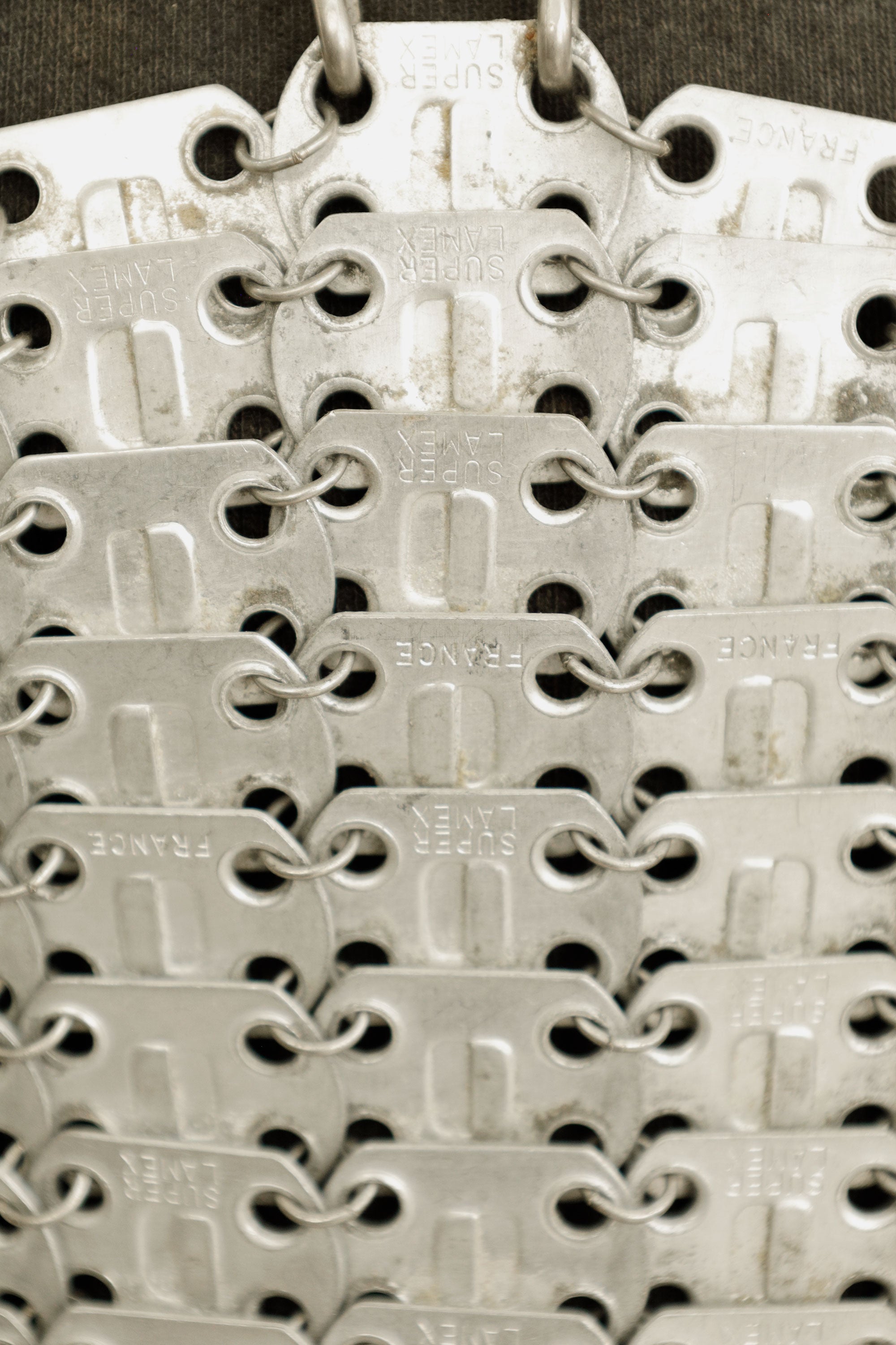 It’s made by linking together small metal plates, each stamped “France Paris,”