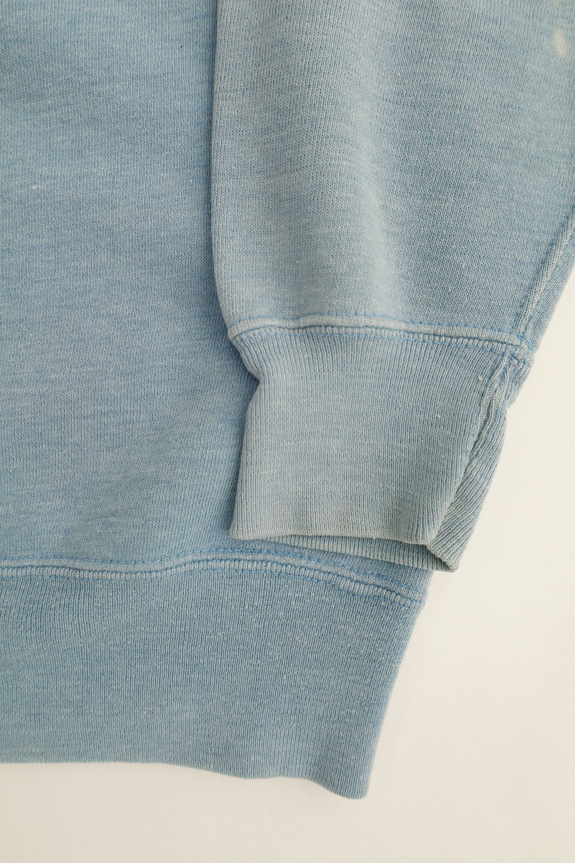 Softly faded blue fleece and a cracked white print show honest wear, making it a clean example of late-60s collegiate Champion sportswear.
